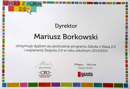 DYPLOM dla dyrektora szkoły p. Mariusza Borkowskiego za ukończenie programu Szkoła z Klasą 2.0 i wspieranie Zespołu 2.0 w roku szkolnym 2014/2015